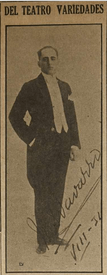 Primer galán joven de la Compañía “Virginia Fábregas”, quien celebra esta noche su función de gracia, con la preciosa obra francesa “Cásate y verás”. La sociedad de Guatemala que quiere y admira al joven actor se prepara a aplaudirlo con toda simpatía.