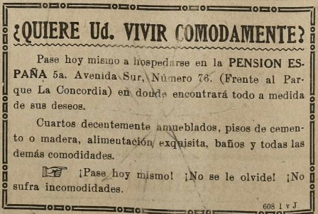 La señora Dolores Escobar v. de Sánchez Rosal, ha trasladado su residencia a la Pensión Española, 5ª Avenida Sur No. 74.