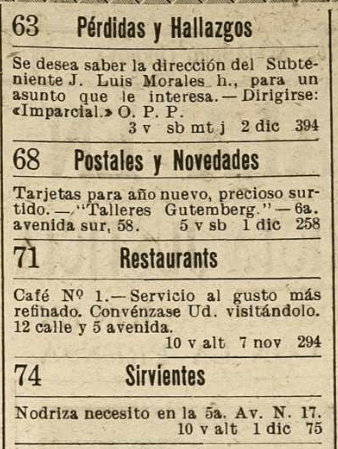 - La distinguida señora Marina González de Gamalero, esposa del señor Guillermo Gamalero, día a luz con toda felicidad el sábado a su primogénito, el cual recibirá con el bautismo los nombres de Mario Guglielmo Dei Baroni di Gamalero.