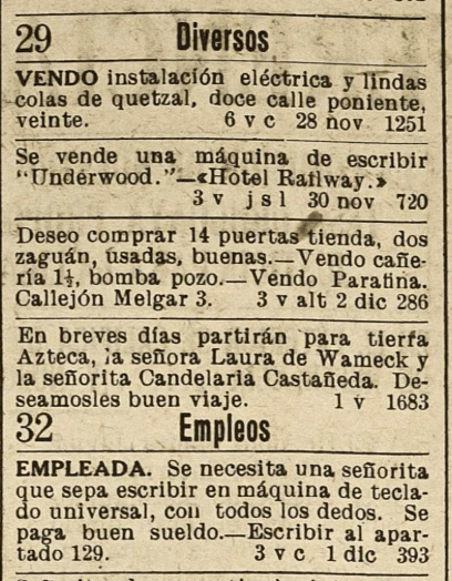- Una nota social de elegancia fue la fiesta organizada por un grupo de caballeros, que se verificó la noche del sábado último en la elegante Pensión Gueroult. A ella asistieron las señoras y señoritas siguientes: señora de Magín, de Koenigsberger, de Hatch, de Wilson, de Cordón, de Trigueros, de Santolino, de Ortega, de Solerti, de Hochstetter, de Wells, de Stein, de Jessup, de Cruze y las señoritas María y Matilde Gueroult, Margot Matheu, María Goubaud Carrera, Leonor Molina, Margot Molina, Marta e Isabel Lowenthal, Cristina Sánchez, Julia y Carmen Lazo, Julia Ayau, María Cristina Cordón, Flory Koenigsberger, Keta Weiss, Elisa y Clara Molina Llardén, Gertrude Weiss, Helena Weissman, María, Marta y Elvira Novella, Eva Liebes, Margarita y Hortensia Lloret, Malyn Trigueros, Clotilde y Ester Dougherti, Victoria, Ester y Tury Ortega y la señorita Weimberg.
